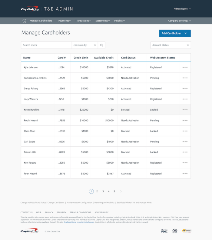 The Manage Cardholders – which included dynamic searching and edit features, launched in February 2018 and is part of the tools sold to large corporate entities as part of their Commercial Credit Card Travel & Expenses suite of offerings.
